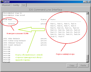 В результате выполнения команды на экране появится: номера vlan – первый столбец, название vlan — второй столбец, состояние vlan (работает он в данный момент или нет) – третий столбец, порты принадлежащие к данному vlan – четвертый столбец. Как мы видим по умолчанию на коммутаторе существует пять vlan -ов. Все порты коммутатора по умолчанию принадлежат vlan 1. Остальные четыре vlan являются служебными и используются не очень часто.