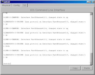 В открывшемся окне перейдите на вкладку CLI . Вы увидите окно консоли. Нажмите Enter чтобы приступить к вводу команд. Информация, которая в данный момент отражена на консоли, свидетельствует о том что интерфейсы FasteEthernet 0/1 – FasteEthernet 0/4 успешно поднялись (то есть теперь они находятся в рабочем состоянии).
