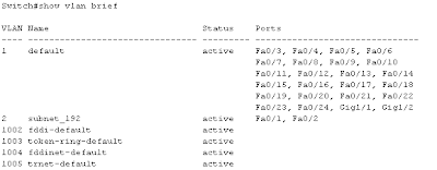 Как легко заметить из результата выполнения данной команды, у нас на коммутаторе появился еще один vlan с номером 2 и именем subnet_192, портами доступа которого являются fastEthernet 0/1 и fastEthernet 0/2.