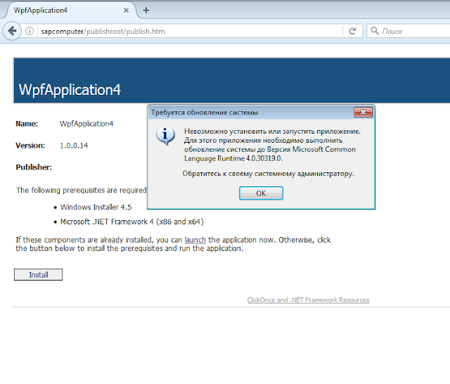 Если изначально на компьютере стоит не подходящий для работы .NET Framework. Тогда запуск WpfApplication4.application пройдет с ошибкой:
