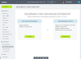 Раньше создание приложений было очень затруднено, но с недавних пор сделать это можно прямо в интерфейсе портала Битрикс24: слева в меню в группе «Приложения» нажимаем кнопку «Добавить приложение».