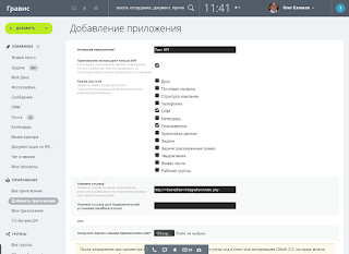 Слева как раз блок «Для личного использования» — нажимаем там «Добавить». Заполняем название, включаем флажок «Приложение использует только API», даём права «CRM», «Пользователи» и «Живая лента», указываем ссылку на своё демо-приложение http:///integration/index.php