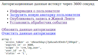 Затем в строках 65 — 91 описывается метод обновить истекшую авторизацию. Далее идёт непосредственно функционал демо-страницы, где пользователю показываются несколько ссылок, нажатия которых приводят к выполнению определённых методов API Bitrix24 и, в свою очередь, взаимодействию с вашим порталом Битрикс24.