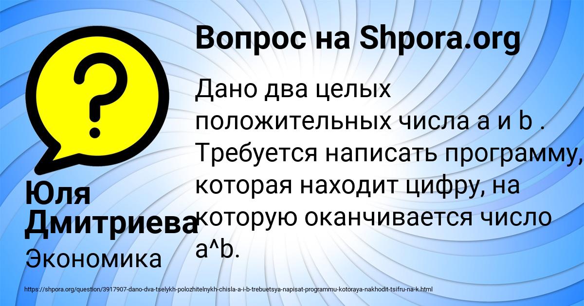 ⭐⭐⭐⭐⭐ Лучший ответ на вопрос «Дано два целых положительных числа a и b . Требуется написать программу, которая находит цифру, на которую оканчивается число a^b.» от пользователя Юля Дмитриева в разделе Экономика. Задавайте вопросы и делитесь своими знаниями.