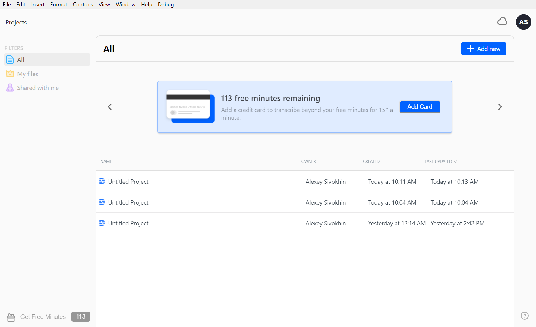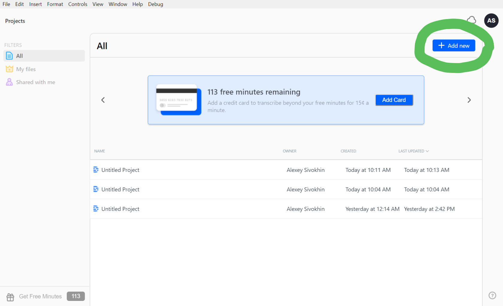Основной экран Descript выглядит очень просто: строка меню, фильтры проектов, список проектов, кнопка Add new.
