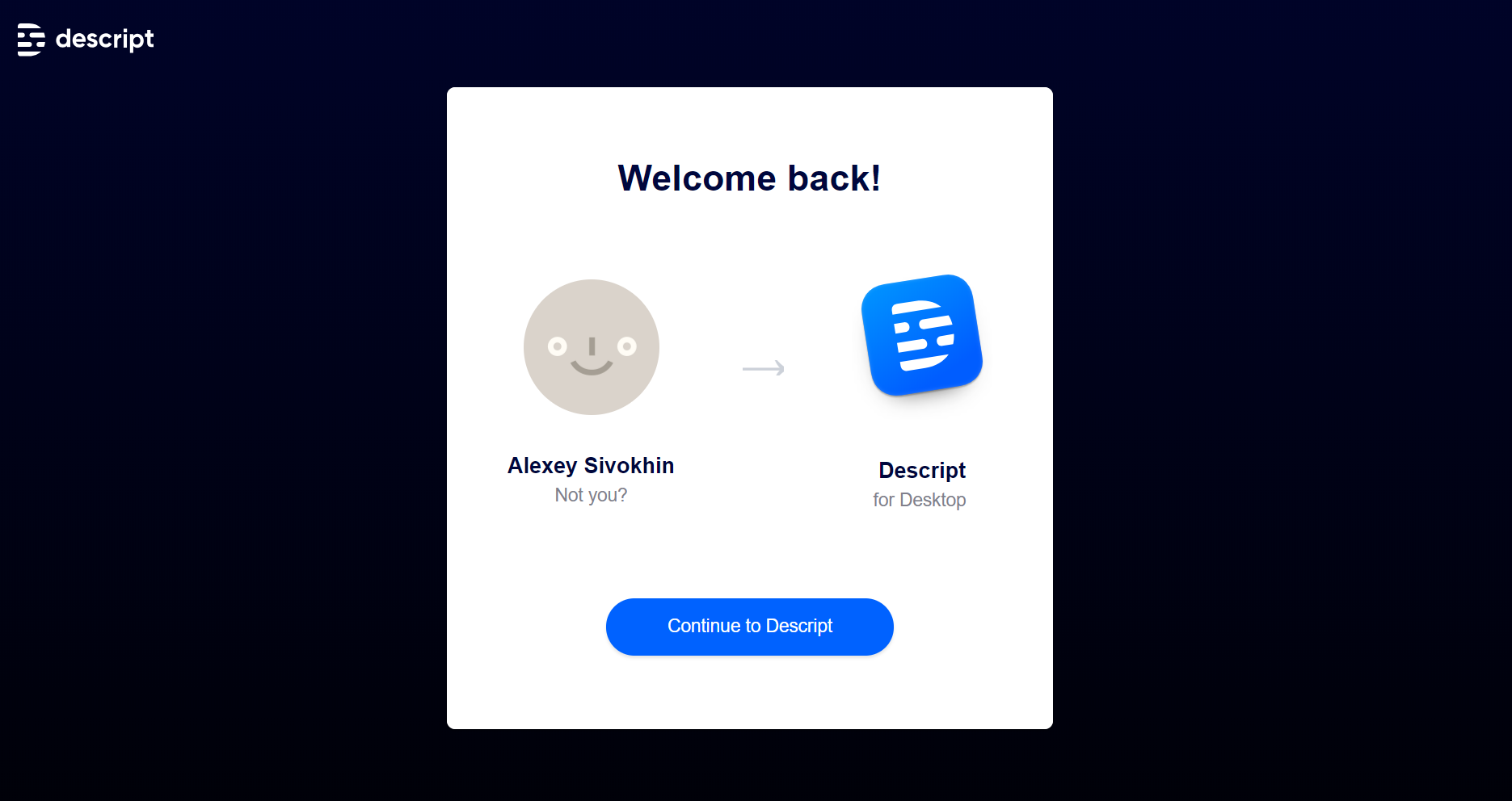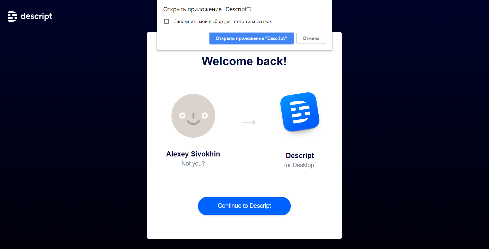 Страница авторизации предлагает открыть приложение Descript. Нажимаем соответствующую кнопку.