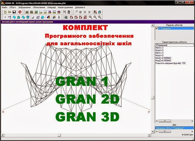 Сьогодні розроблено вже значну кількість програмних засобів, використання яких дозволяє розв’язувати за допомогою комп’ютера досить широке коло математичних задач різних рівнів складності. Найбільш придатними для підтримки вивчення курсу математики в середніх навчальних закладах видаються комплект програм Gran (Gran1, Gran-2D, Gran-3D). Названі програмні засоби прості у використанні, оснащені досить зручним і “люб’язним” інтерфейсом, максимально наближеним до інтерфейсу найбільш поширених програм загального призначення (систем опрацювання текстів, управління базами даних, електронних таблиць, графічних і музичних редакторів і ін.), контекстно-чутливою допомогою. Від користувача не вимагається значний обсяг спеціальних знань з інформатики, основ обчислювальної техніки, програмування тощо, за винятком найпростіших понять, цілком доступних для учнів середніх класів.