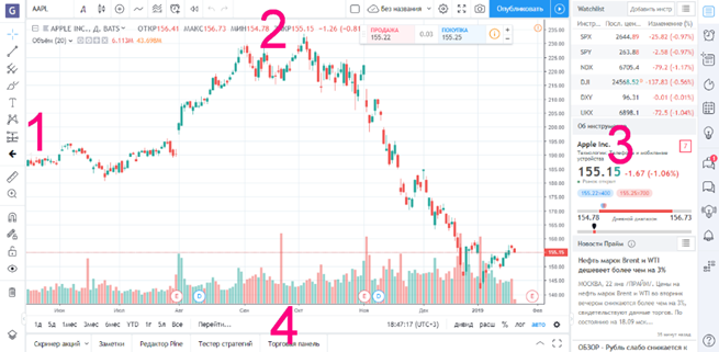 Как можно видеть, слева находятся графические инструменты, справа торговые активы, новости и информация об инструменте, вверху дополнительный функционал в виде индикаторов, стратегий, переключения тайм фреймов и другие визуальные опции, а внизу панель времени, скринер, редактор кода, тестер и торговая панель.