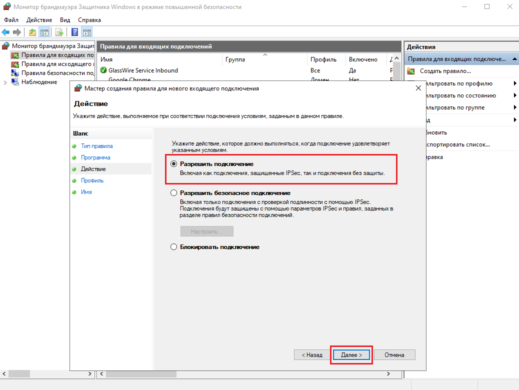 В окне «Действие», выбираем вариант «Разрешить подключение» и нажимаем «Далее»: