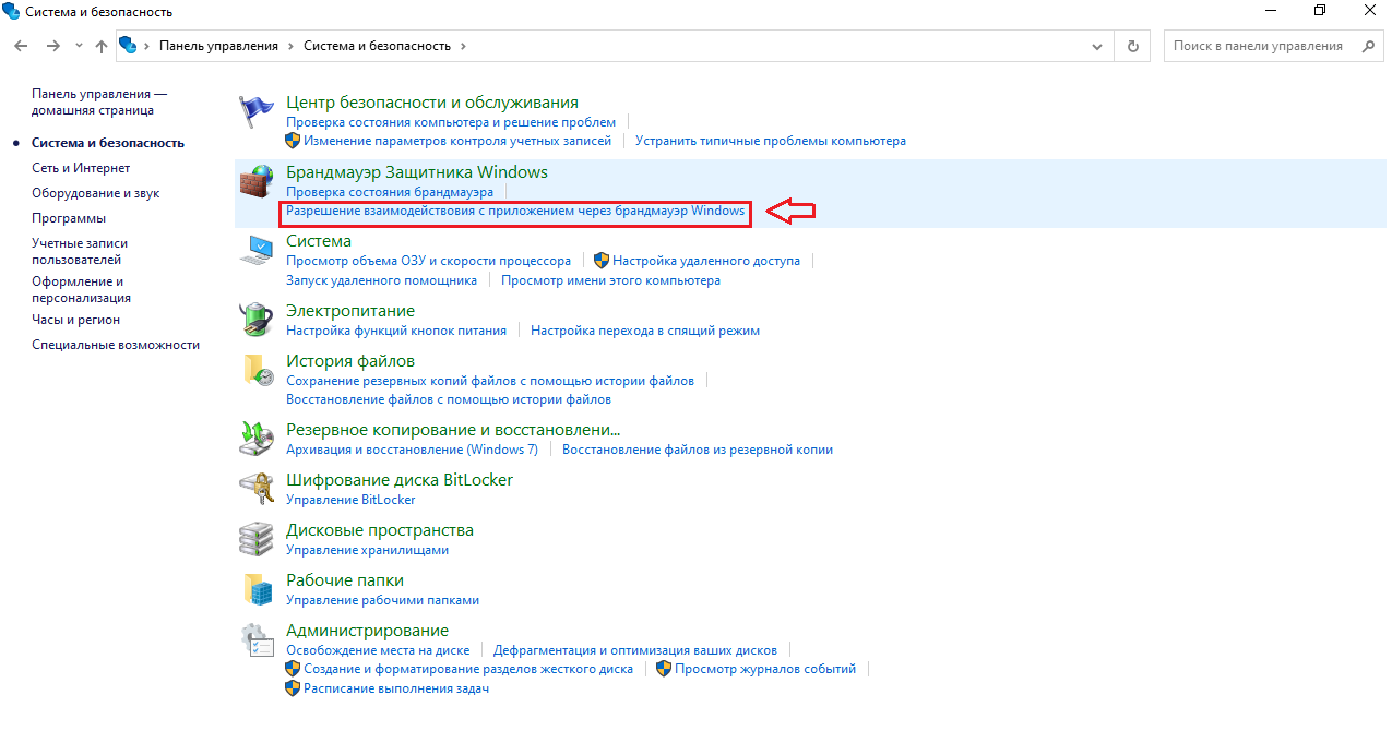 - Зайдите в «Система и Безопасность» и откройте вкладку Брандмауэр: