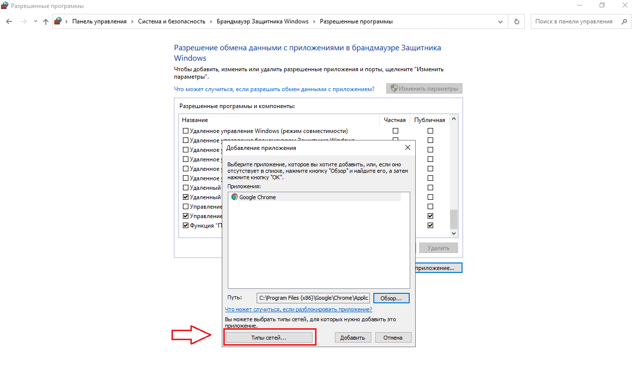 После, нужно указать, для какой Сети будет действовать правило брандмауэра Windows. Для этого, после выбора приложения, нажимаем «Типы сетей. »:
