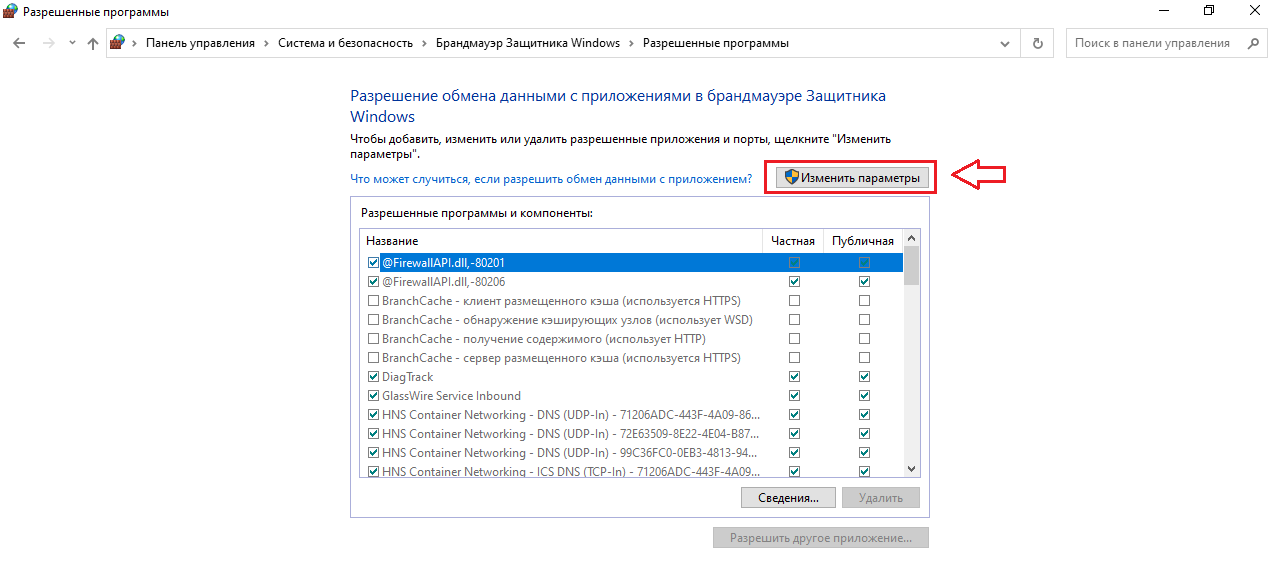 В открывшемся окне «Разрешение обмена данными с приложениями в брандмауэре Защитника Windows», нажимаем на кнопку «Изменить параметры»: