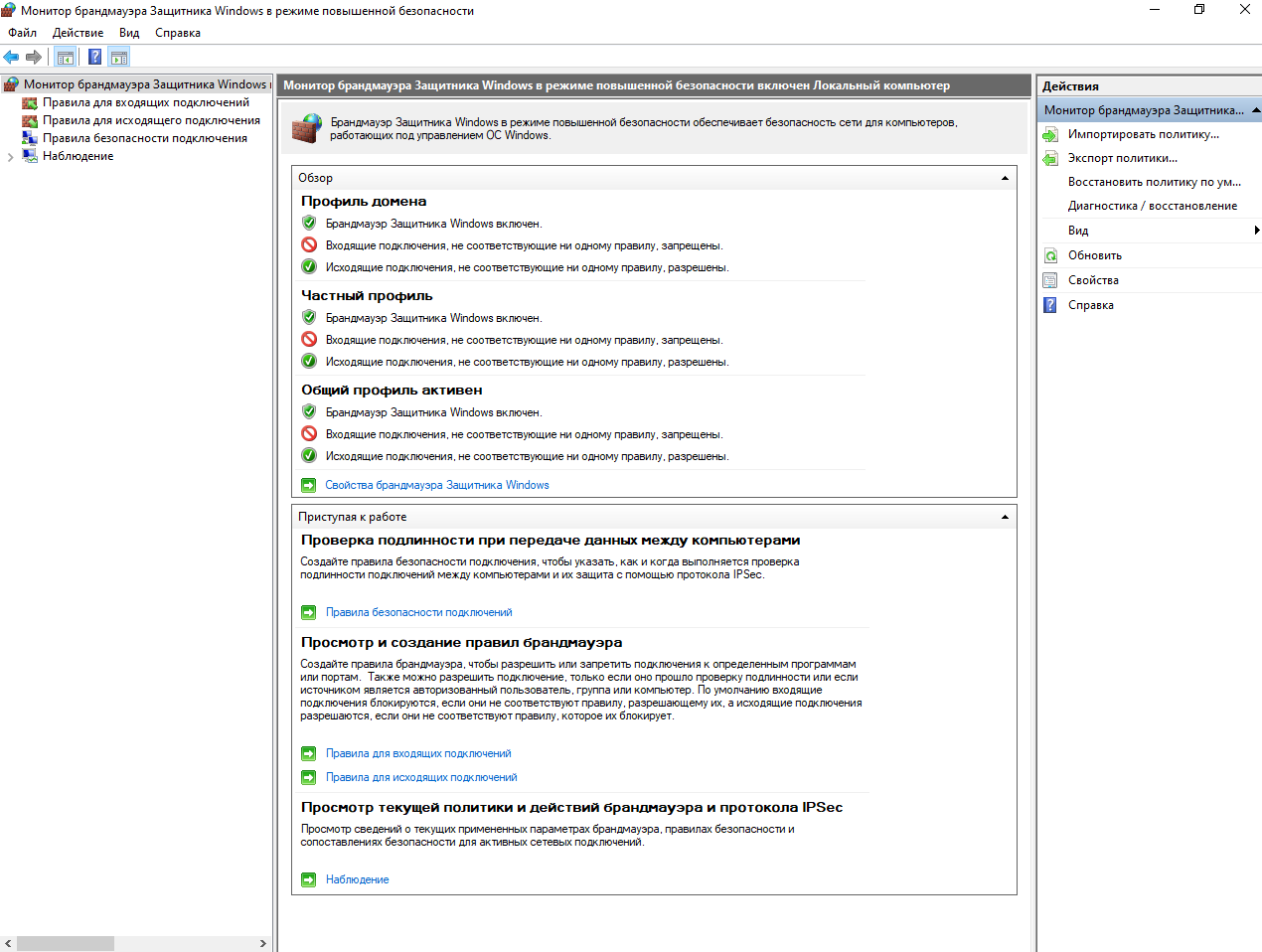 Если в ходе манипуляций скриптами и командлетами совершены ошибки, их всегда можно исправить через стандартное меню брандмауэра. Система не блокирует общее окно и модуль режима повышенной безопасности.