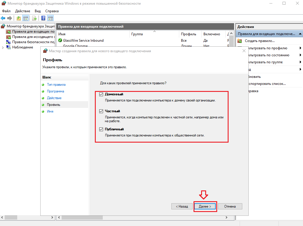 - Домен — соединение будет заблокировано, только если компьютерная система подключена к домену или корпоративной сети.
