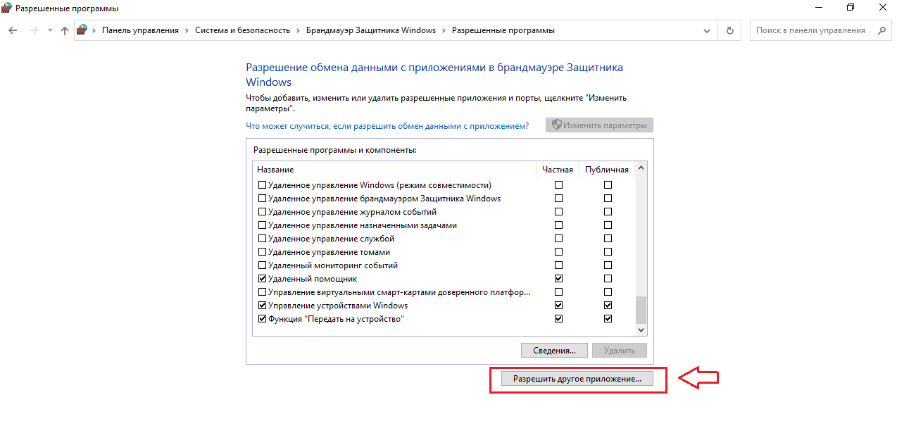 Ставим галочки напротив приложения для разрешения его работы - Если в предложенном списке нет нужной вам программы, нажимаем кнопку «Разрешить другое приложение», прописываем путь к нужному файлу с расширением .exe и щёлкаем «Добавить».
