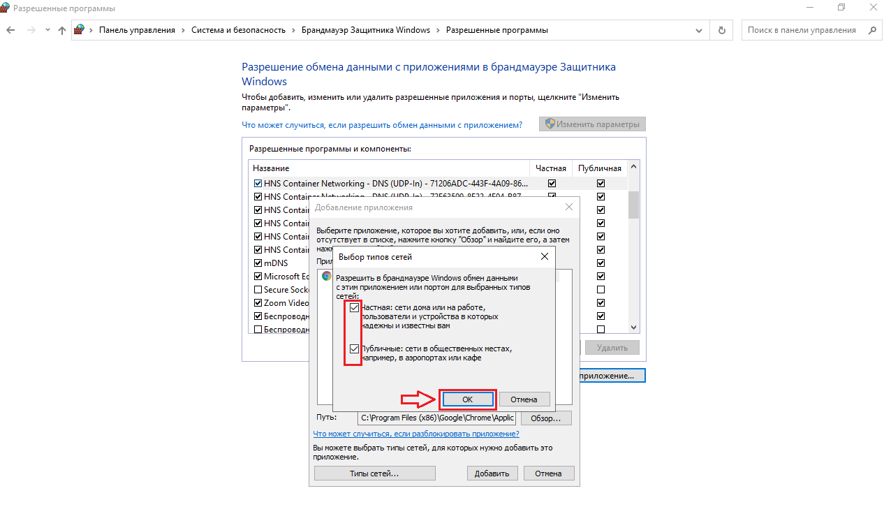 В открывшемся окне «Выбор типов сетей», выбираем нужные сети (Частная и Публичная) ставя галочки напротив и нажимаем «ОК»:
