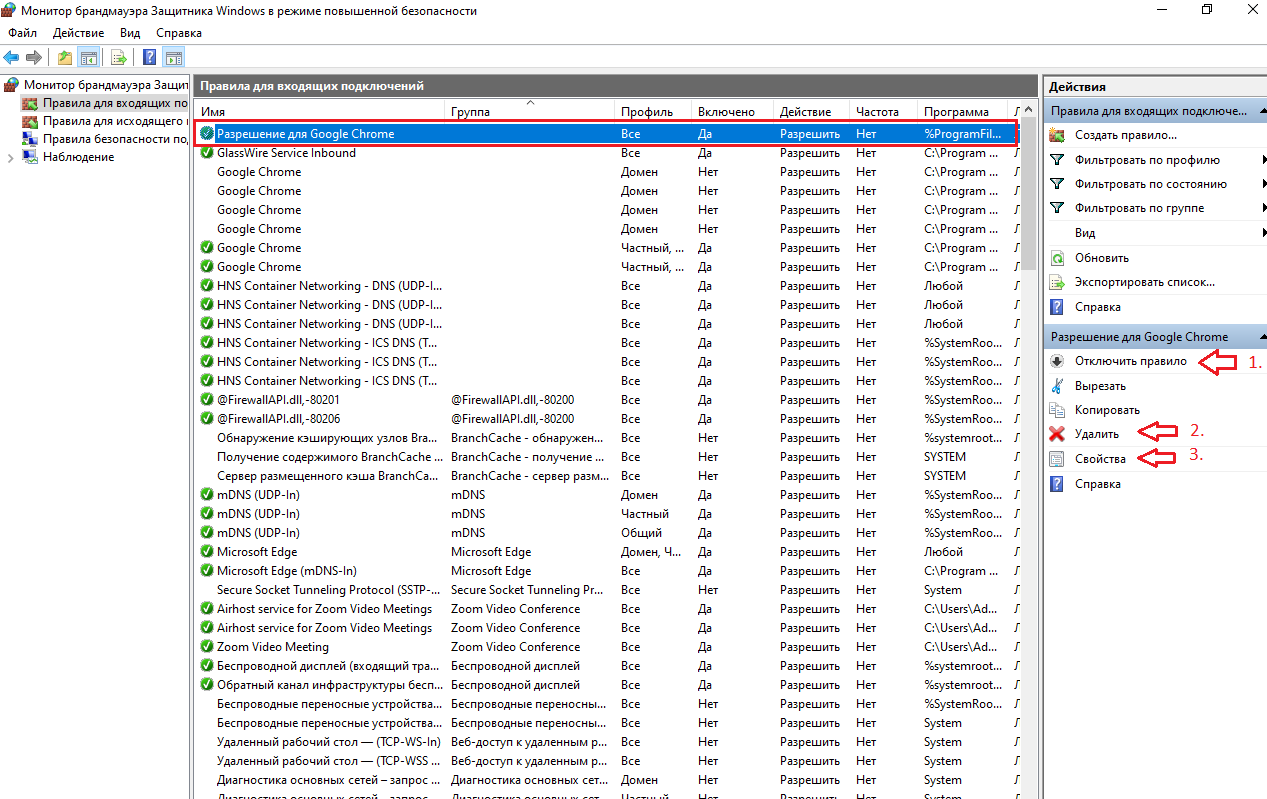 Брандмауэр позволяет также удалять правила и созданные разрешения. Производится удаление проще, чем создание.