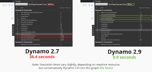 Разработчиками Dynamo была проделана большая работа, итогом которой стало улучшение производительности целевых геометрических нод: на графике видно, что Point.PruneDuplicates и Curve.ParameterAtPoint теперь работают в 35 раз быстрее, чем в предыдущих версиях. Технические характеристики компьютера и объем данных могут немного влиять на скорость, но значительный прирост производительности остается бесспорным.