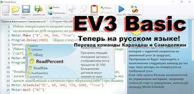 EV3 BASIC — свободно распространяемая среда программирования для платформы LEGO Mindstorms EV3, основанная на языке Бейсик. Наш перевод EV3 BASIC на русский язык вошел в новую версию среды программирования 1.0.9