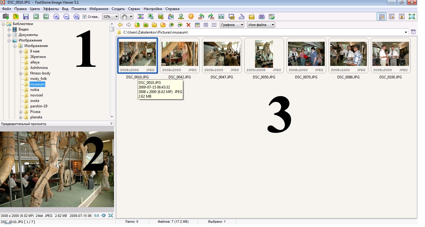 и 3- поле, где отображаются все фотографии, находящиеся в выделенной вами папке.