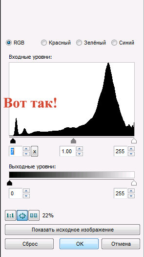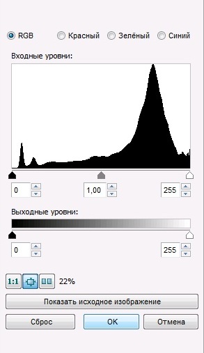 В данном случае график гистограммы показывает, что со светами-тенями на фото всё не так уж плохо), однако нужно, как минимум, подвинуть черный ползунок к началу первого «всплеска» на графике.