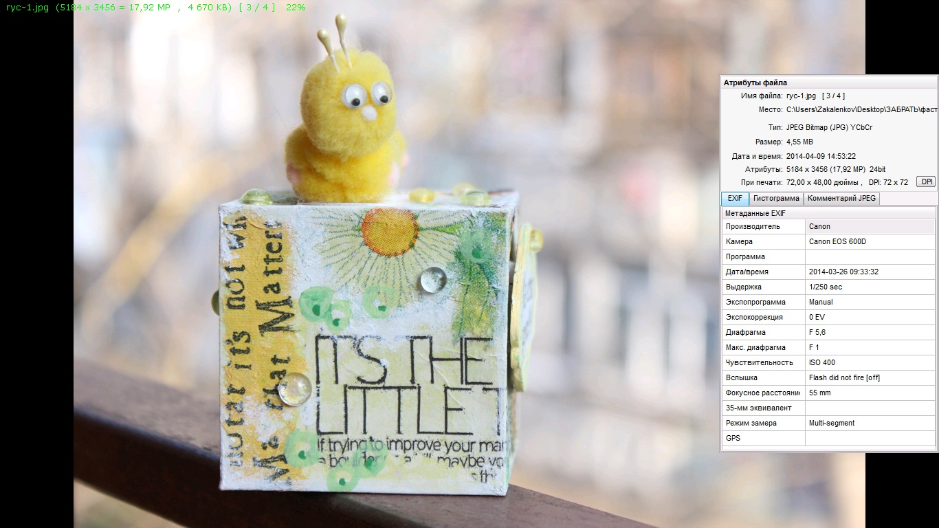 Здесь можно посмотреть свойства изображения: когда был сделан фотоснимок, с какими настройками выдержки и диафрагмы и т.д.
