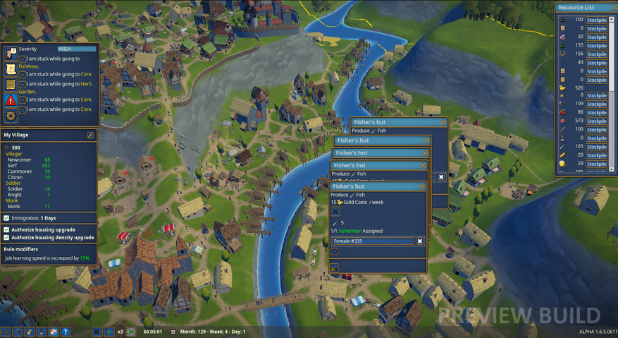 А вот интерфейс в игре — отдельная проблема. Он загроможден и не интуитивен. Множество нужных индикаторов или недоступны вообще, или спрятаны от начинающего игрока. Когда же игрок все-таки начинает открывать информацию, она быстро загромождает весь экран. Например, здесь открытие информации по одному зданию или жителю не закрывает другие аналогичные.