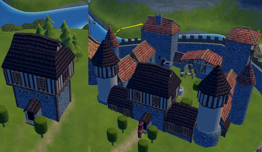 | Строительство монументов открывает много возможностей. Слева — особняк в начале игры, справа — в конце. Каждое отдельное крыло, башню или куст можно было поставить в любую позицию и в любом количестве — лишь бы ресурсов хватило. |