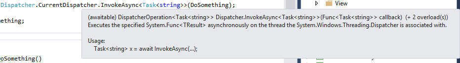 var doSomething = await Dispatcher .CurrentDispatcher.InvokeAsync< Task < string >>(DoSomething);