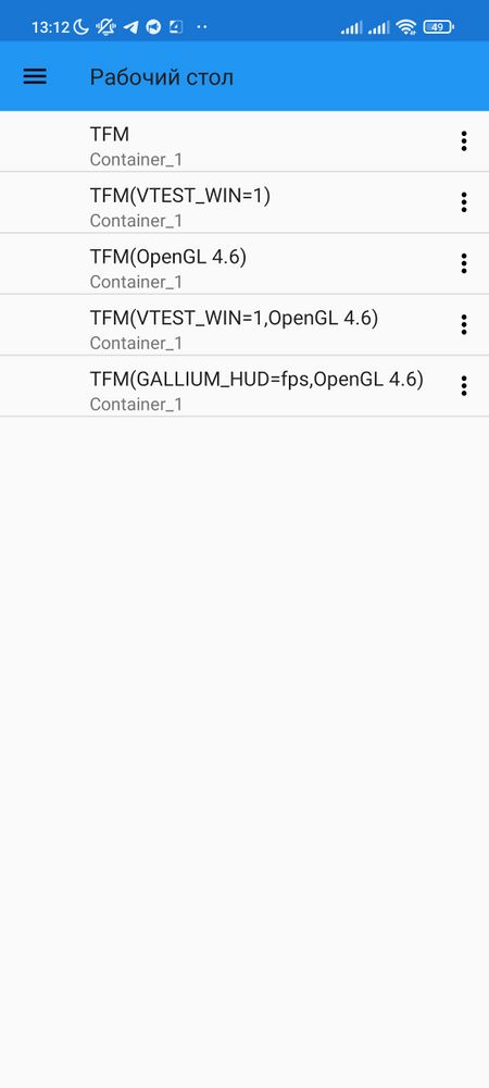 После завершения распаковки кеша, вам необходимо создать контейнер с необходимым вам разрешением(разрешения которые соответствуют разрешению экрана, например 2400х1080 есть в модифицированных APK), и с 32 битной глубиной цвета(иногда старым играм требуется 16, учтите это) и с необходимым управлением. Запустите с рабочего стола TFM(необходимо выбрать тот, который соотвествует вашему устройству(например: «Mali, OpenGL 3.3″ или подобное)». Если на выбор есть только один TFM, то запустите его. Можно запустить контейнер из «Меню->Управление контейнерами->Нажать три точки возле названия контейнера->Запустить».