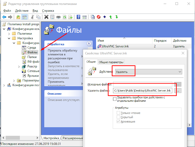 Чтобы удалить ярлык на рабочем столе, который хранится в папке c:UsersPublicDesktopсоздаем объект групповой политики компьютера GPO (Computer Configuration —> Preferences —> Windows Settings —> Files)удалить файл C:UsersPublicDesktopfile.lnk.