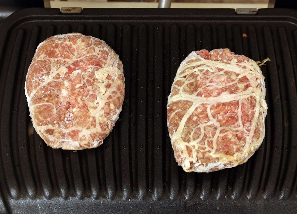 Котлеты. Решив проверить, как работает программа «Разморозка», мы купили котлеты из трех сортов мяса в жировой пленке. Заморозили накануне испытаний при температуре -18°С, придав толщину 2 см. Включаем и нагреваем прибор, выбираем функцию «Разморозка», потом «Бургер», закладываем котлеты.