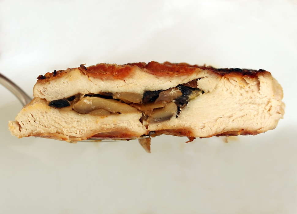 Чтобы начинка не выпала, класть нужно разрезом вверх или заколоть деревянной зубочисткой. Закладываем фаршированную грудку. Она более объемная. Жарим на том же режиме «Птица».