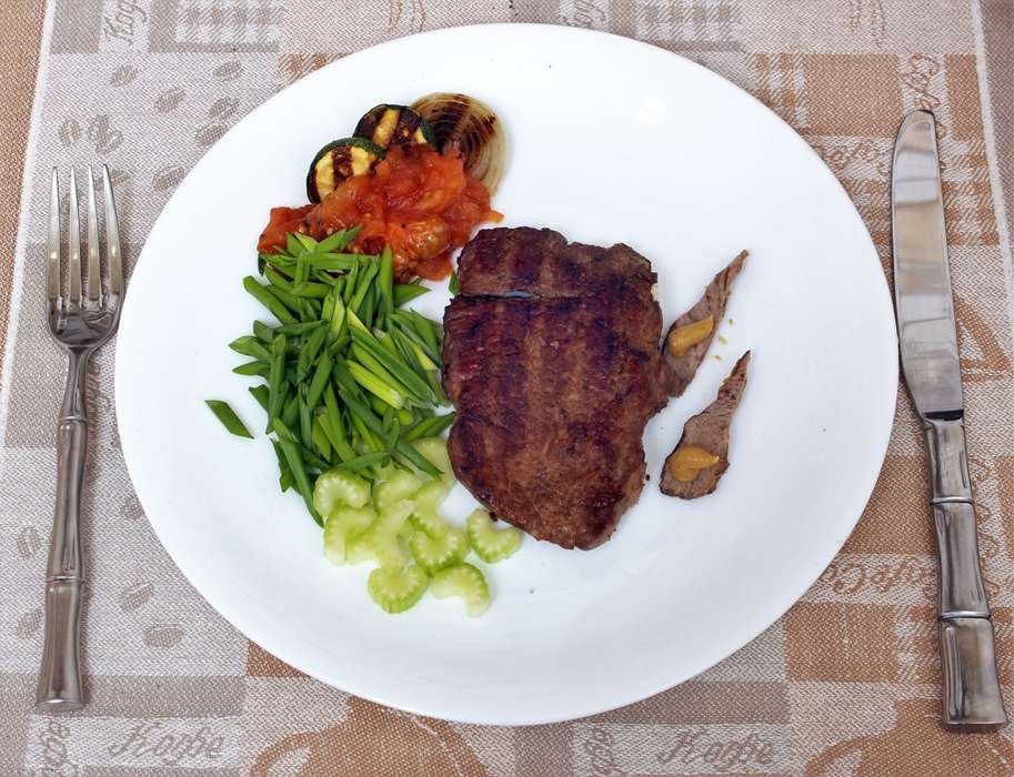 Раз уж производитель позиционирует свое изделие как прибор для приготовления идеального стейка, мы выбрали в сетевом магазине самый «толстый» (3,5 см) стейк «Стриплойн Ангус». Мы не ищем легких путей, поэтому решили усложнить задание и потестировать гриль на приготовление антрекотов, куриной грудки простой и с наполнением. И, наконец, посмотреть, как работает функция разморозки. Конечно, были пожарены и овощи!