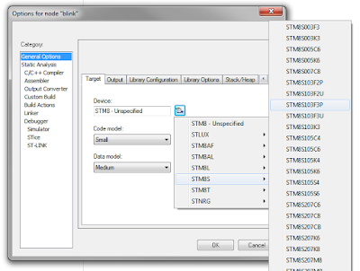 - В категории «General Options» на вкладке «Target» выбираем нужный микроконтроллер. У меня под рукой STM8S103F3P6, соответственно выбираем «STM8S103F3P».