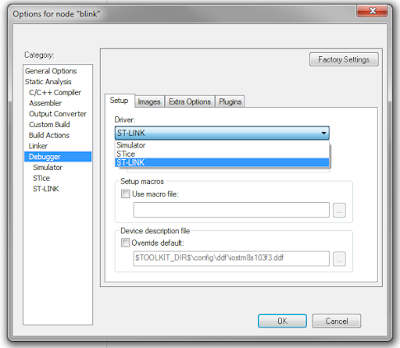 - Переходим к категории «Debugger», во вкладке «Setup» выбираем то, чем будем программировать / отлаживать наше устройство. Я использую ST-Link, поэтому выбираю именно его. Больше никакие настройки на первом этапе нас не интересуют, поэтому жмем «OK» и приступаем к написанию кода.