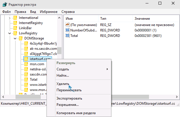 Если найдется раздел реестра (папка слева), содержащая istartsurf в названии, то кликните по ней правой кнопкой мыши и выберите пункт меню «Удалить». После этого в меню «Правка» нажмите «Найти далее» (или просто клавишу F3).