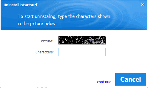 Откроется окно удаления istartsurf с компьютера (При этом, как я понял, оно видоизменяется со временем и у вас может отличаться внешне). На ваши попытки удалить istartsurf он будет всячески сопротивляться: предлагать ввести капчу и сообщать, что она введена неверно (при первой попытке), демонстрировать специально запутанный интерфейс (к тому же на английском языке), а потому подробно продемонстрирую каждый шаг использования деинсталлятора.
