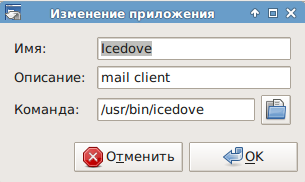 Открываем окошко, вписываем название программы Icedove, помечаем, что это за приложение (я написала mail client). Указываем путь к программе, нажав на значок папки, приложение ищем в /usr/bin:
