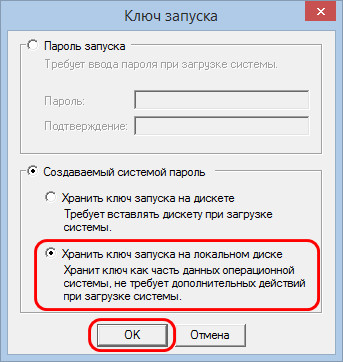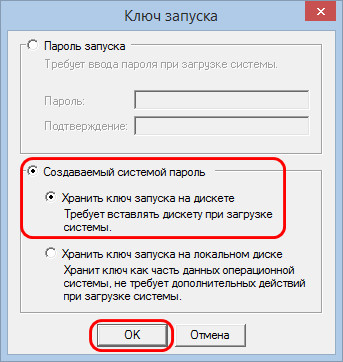 Выбираем пункт «Хранить ключ запуска на дискете». Жмакаем «Ок».