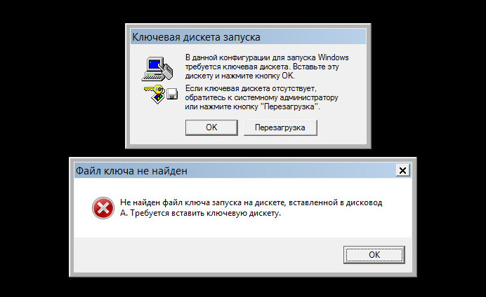 В данной конфигурации для запуска Windows требуется ключевая дискета Вставьте эту дискету и нажмите кнопку ОК.