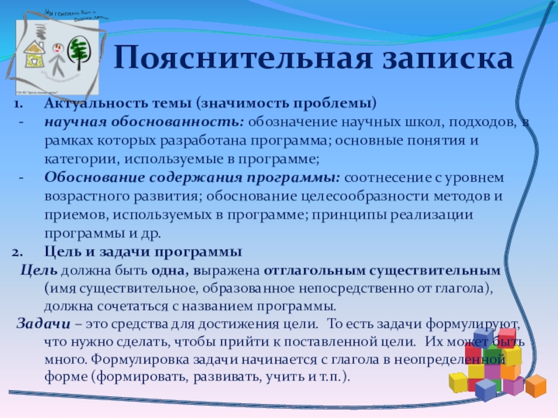 3. Пояснительная записка должна содержать максимально полную информацию об основных идеях программы, их актуальности и предполагаемой востребованности; содержании, предлагаемого детям образования и принципах организации процесса его освоения детьми определенного возраста; сроках реализации программы; принципах формирования учебных групп; особенностях программы, используемых в ней ключевых понятий; особенностях возрастной группы детей, на которых рассчитана программа; формах занятий.