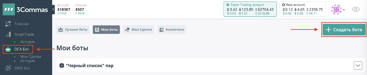 Перейдите в главное меню и выберите вкладку DCA-Бот, а затем нажмите кнопку Создать бота: