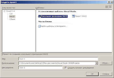 В этом окне выбираем в левой части окна Win32 и в правой части Win32 Console Application (Консольное приложение Win32) .Задаем имя нашему проекту какое вам захочется. В строке Location(Расположение)можно поменяем путь сохранения проекта. И нажимайте Ок.