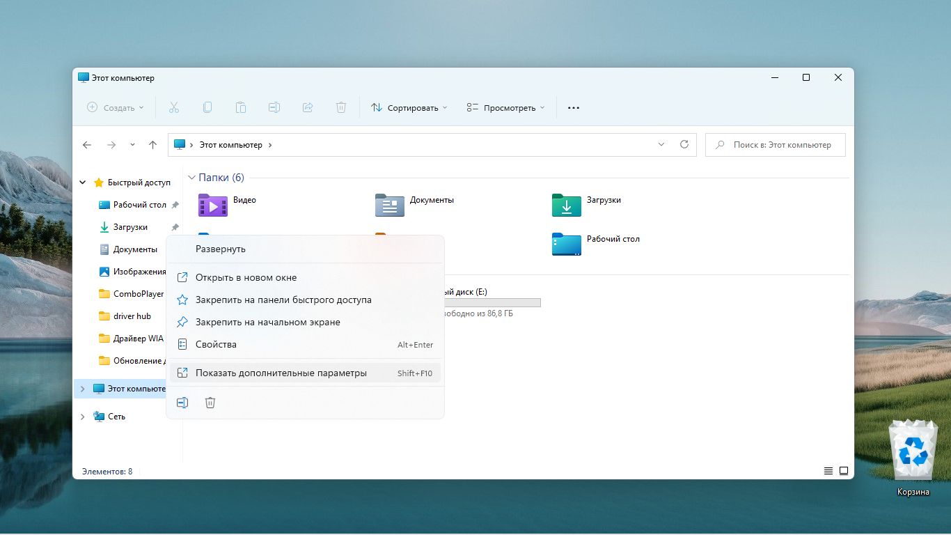 Кликните правой клавишей мыши на Этот компьютер и выберите Показать дополнительные параметры.