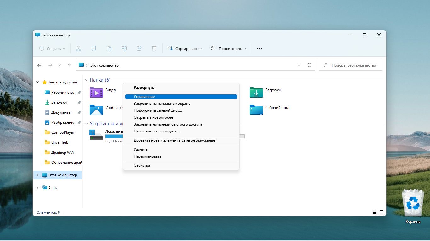 В появившемся списке откройте пункт Управление.