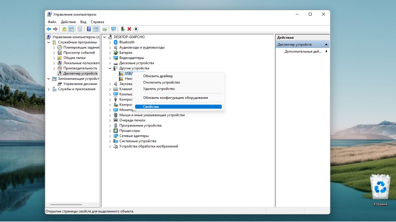В открывшемся перечне можно увидеть, для каких устройств на компьютере драйвера все еще не были установлены – они обозначены желтыми восклицательными знаками. Нажмите правой клавишей мыши по одному из них и откройте его Свойства.