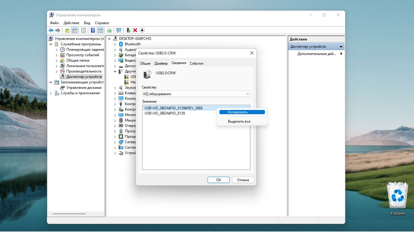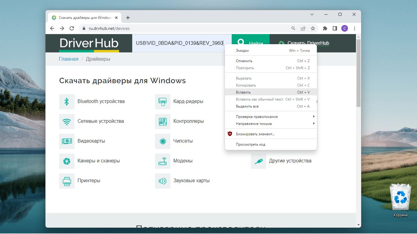 Найденный идентификатор можно использовать для того, чтобы подобрать драйвер в базе драйверов, например на сайте: https://ru.drvhub.net/devices Перейдите на сайт, нажмите правой клавишей на поле поиска и выберите Вставить. Скопированный вами идентификатор отобразится там.
