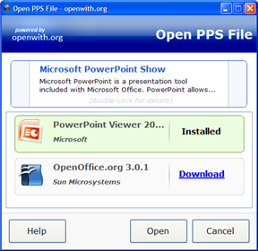 Качаем и устанавливаем программу OpenWith.org , эта программа выполняет автоматический поиск бесплатных программ для открытия нужного Вам файла. Как Вы можете видеть с картинки ниже, мы добавили в программу файл с неизвестным расширением (форматом) и программа, после определения всех необходимых данных выдала нам название программного обеспечения при помощи которого можно открыть данный файл. Как видите, на данном компьютере одна из необходимых для открытия файла программ уже установлена (Power Point), а вот другой нужной программы не хватает и её нужно установить. Как видите программа сразу же предоставляет ссылку на скачивание этого программного обеспечения.