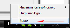 Все, теперь полностью закрываем все открытые копии Skype, щелкнув второй кнопкой мыши на иконке программы в “трее” и выбрав пункт меню Выход.